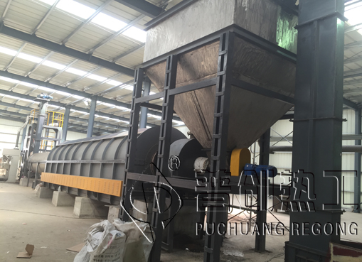 活性炭粉體材料用斗提機或其他上料機構(gòu)上料到平臺上的料倉,通過料倉內(nèi)翻料機輸送到螺旋加料機,均衡的把粉體物料輸入到回轉(zhuǎn)爐的爐體內(nèi)進行焙燒。