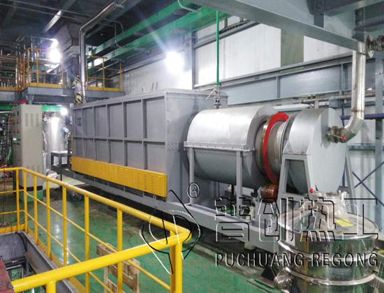 回轉(zhuǎn)爐的熱源來自電阻絲,本回轉(zhuǎn)爐采用筒體底部加熱方式。因此需要烘干的物料,從進(jìn)料箱、進(jìn)料溜進(jìn)入筒體,即被螺旋抄板推向后。由于回轉(zhuǎn)爐傾斜放置,物料一方面在重力和回轉(zhuǎn)作用下流向后端,另一方面物料被抄板反復(fù)抄起,帶至上端再不斷地?fù)P撒下來,使物料在筒內(nèi)形成均勻的幕簾,充分與筒內(nèi)的熱氣流進(jìn)行熱交換,由于物料反復(fù)揚(yáng)撒,所含的水分逐漸被烘干,從而達(dá)到烘干的目的
